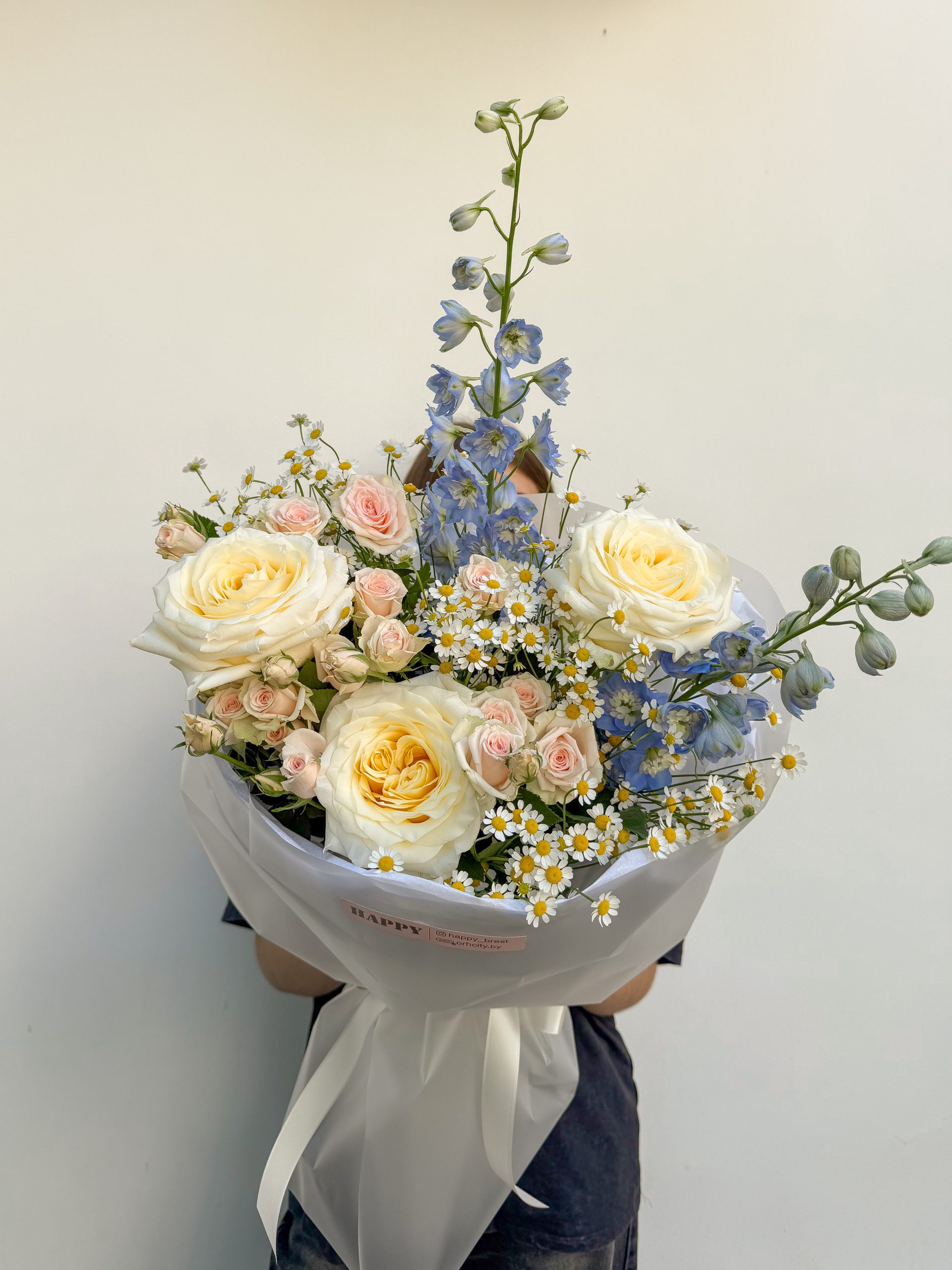 Состав: Пионовидная роза, ромашки, дельфиниум